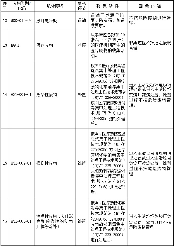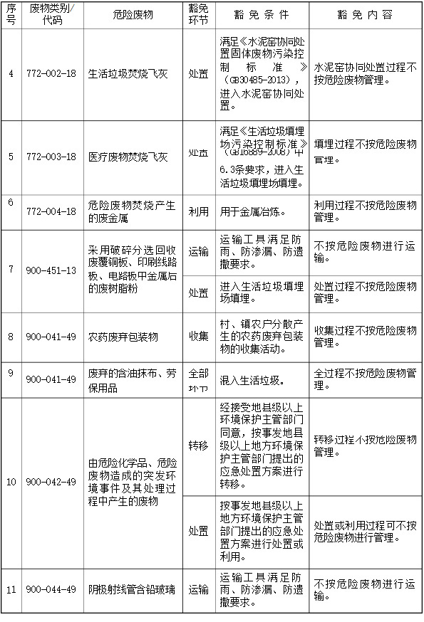 第五條 列入本名錄附錄《危險廢物豁免管理清單》中的危險廢物,在所列的豁免環(huán)節(jié),且滿足相應的豁免條件時,可以按照豁免內容的規(guī)定實行豁免管理。