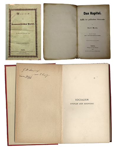 左上圖為1848年《共產黨宣言》德文第一版。右上圖為1867年《資本論》德文第1卷第一版。下圖為恩格斯的題字贈書《社會主義從空想到科學的發展》,1892年英文版。 中央黨史和文獻研究院供圖